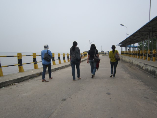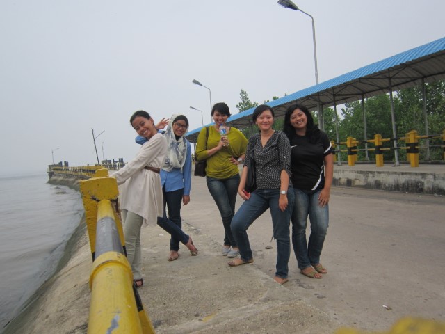 Antrilah kami dengan sabar dan pasrah. Yang penting, Pulau Bengkalis sudah hampir kami capai. Untuk mengisi waktu, kami berlima turun dari mobil dan main di pinggir pelabuhan. Gak lupa juga untuk foto-foto di pelabuhan yang selama ini kami cari 😛 Sempet diliatin orang di sana, tapi kami cuek bebek. Yah, namanya juga orang kota, mungkin kami tampak seperti tante-tante girang, dan kece-kece, maklum aja deh.