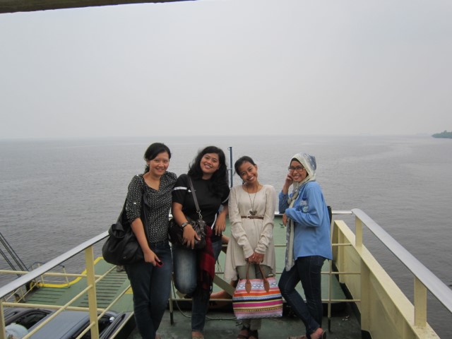 Tepat pukul 15.00 WIB kami akhirnya kebagian untuk naik ferrynya. Waahh senangnya bukan main. Setelah parkir mobil di lantai bawah ferry, kami berlima langsung naik ke lantai atas untuk menikmati laut.