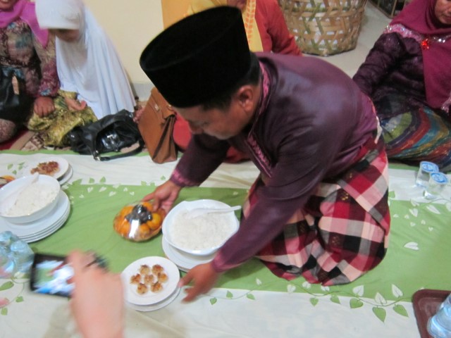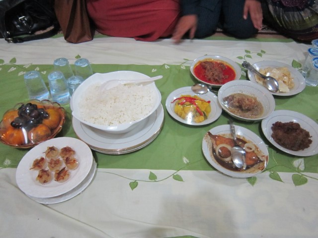 Acara selanjutnya sudah tentu yang paling ditunggu-tunggu yaitu acara makan malam hahahhaha…. Adalah suatu pengalaman baru bagi saya, dan mungkin teman-teman saya, bahwa makan malam disini tidak menganut sistem standing party. Sistem yang dianut adalah pesta duduk. Satu paket makanan (terdiri dari kerang masak sereh, ikan masak kecap, gulai sapi, gulai kambing, acar nanas, emping, dan kue kecil), diestafetkan kepada para tamu yang hadir. Satu paket makanan tersebut diestimasikan akan habis untuk 4 orang. Jadi, tiap 4 orang, akan ada satu paket menu baru lagi. Uniknya lagi, yang menyajikan makanan tersebut adalah kaum pria, beda dari budaya kebanyakan bahwa yang menyajikan makanan sudah tentu para wanita.
