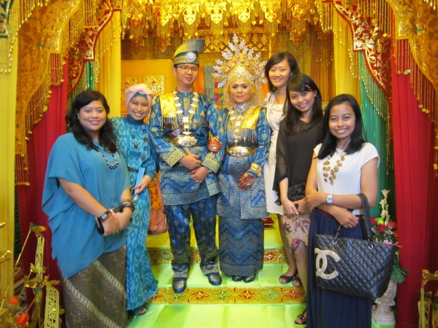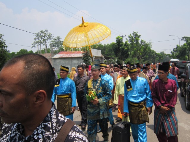 Selesai prosesi datangnya sang pengantin pria, kami langsung nodong foto-foto dengan kedua pengantin. Foto berkali-kali, padahal antri salaman. Maaf ya, warga Bengkalis.. 🙂