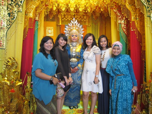 Jam 10.30 WIB kami udah kece dan siap meluncur ke resepsi pernikahan Asri. Sampai disana ternyata lumayan kecepetan. Pengantin prianya belum datang. Akhirnya Kak Tina mempersilahkan kami untuk makan siang duluan. Sebelum makan kami sempatkan dulu foto dengan pengantin perempuan yang sudah cantik duduk di pelaminan. Foto yang banyak sebelum pengantin prianya datang. Hehehehehehehe…