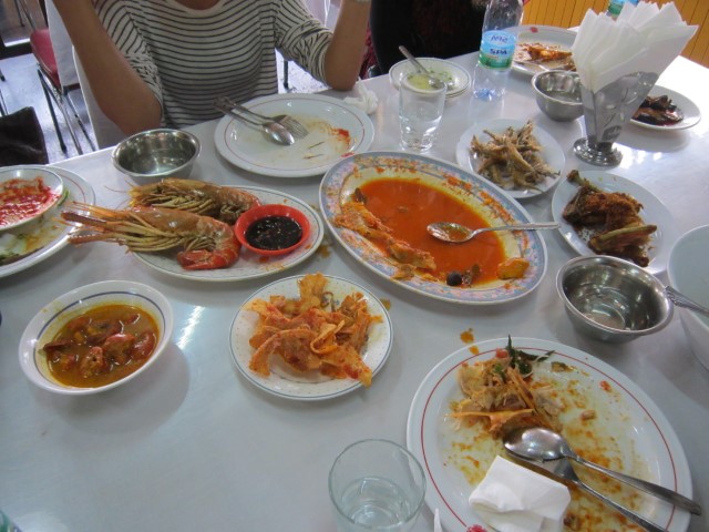 Gak butuh waktu lama, makanan yang terhidang di depan kami ludes. Makan, menggunakan tangan dengan mencampur nasi dan lauk yang diambil, nikmat betul. Mau ambil nasi lagi pun dipersilahkan. Cita rasa makanan di sana pun cocok di lidah saya. Gulainya terlihat pedas, tapi ternyata tidak sepedas yang saya kira. Cenderung tidak pedas malah. Padahal kuahnya merekah merah. Favorit saya di menu itu kerang masak sereh dan ikan masak kecap.
