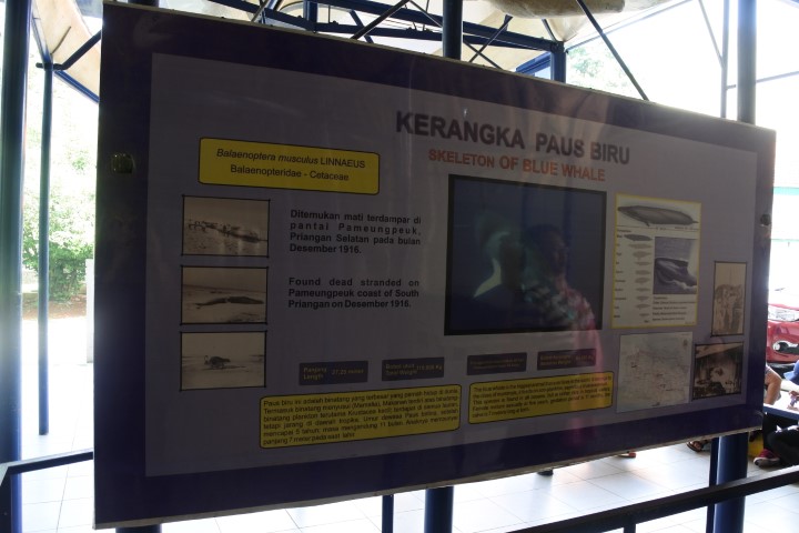 Akhir perjalanan gw menyusuri MZB, ditutup dengan sebuah kata ‘wow’. Apa sebab? Di pintu keluar MZB, kita akan melihat kerangka salah satu mamalia terbesar di dunia, kerangka Paus Biru. Kerangka ini asli, diambil dari seekor Paus Biru yang ditemukan mati terdampar di Pantai Pameungpeuk pada Desember 1916. Kerangka ini kemudian dibersihkan dan disusun kembali sesuai aslinya.